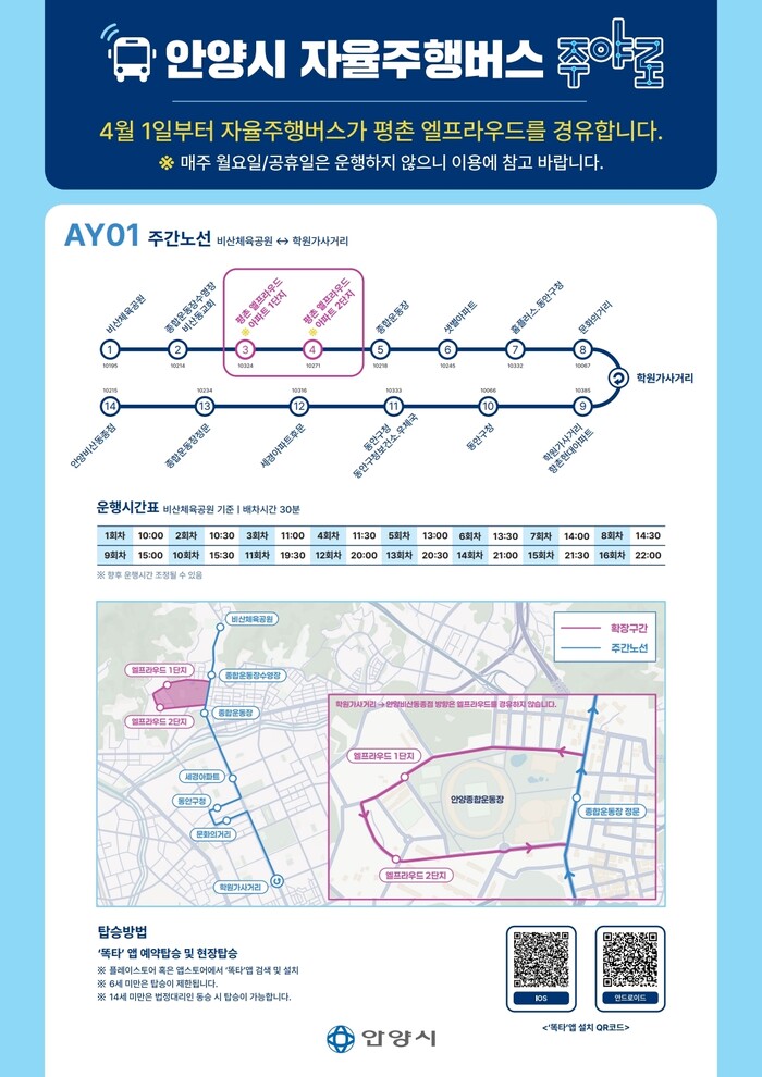 운행 노선도 일부 연장됐다. ‘주야로’는 평촌엘프라우드 아파트를 새롭게 경유해 1단지와 2단지에 각각 정차한다. 상행선(비산체육공원→학원가사거리 방면)은 종합운동장수영장.비산동교회 정류장을 거쳐 평촌엘프라우드 아파트 1, 2단지에 각각 추가 정차한다. 반면 하행선(학원가사거리→비산동 종점)은 기존과 동일하게 해당 아파트를 경유하지 않는다.