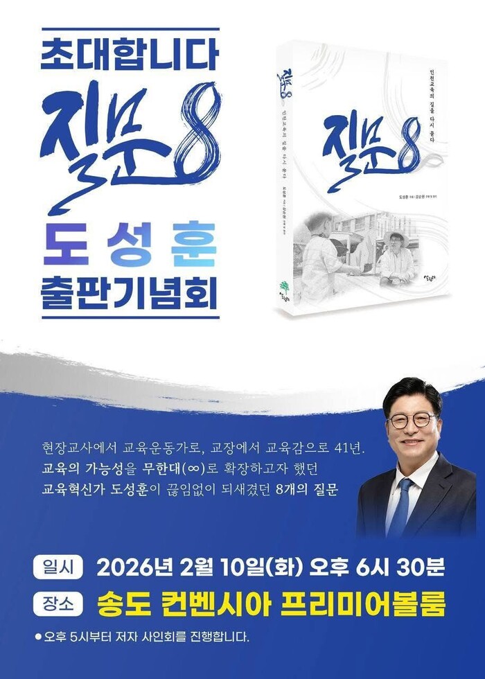 이어 "계절이 바뀌듯 교육도 늘 새로워져야 한다고 생각한다. 아이들이 매일 조금씩 자라고, 학교가 조금씩 변하고, 우리 교육이 한 걸음씩 앞으로 나아가는 과정이 곧 봄을 준비하는 시간이라 믿는다. 인천교육은 그런 변화의 온기를 놓치지 않겠다"며 "그동안 품어온 교육의 생각과 기록을 한 권의 책에 담았습니다. 혼자가 아닌, 함께 만들어 온 이야기이다. 오는 2월 10일 오후 6시 30분, 그 이야기를 직접 나누는 자리를 마련했습니다. 바쁘시겠지만 함께해 주신다면 큰 힘이 되겠습니다. 봄을 맞는 길목에서 여러분과 만나 뵙길 기대한다"고 밝혔다.
