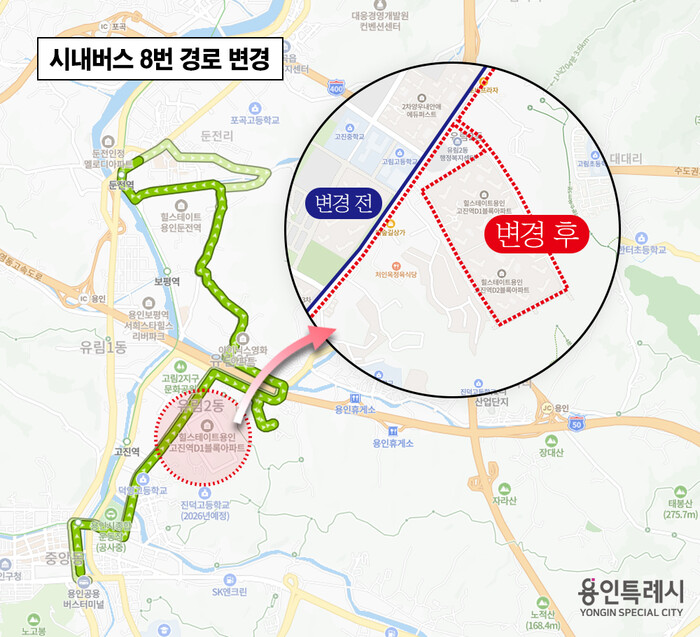 용인특례시(시장 이상일)는 오는 10일부터 시내버스 8번과 마을버스 5번이 유림2동 고진역 힐스테이트 1,2 단지 내부를 경유하도록 노선이 변경된다고 8일 밝혔다.