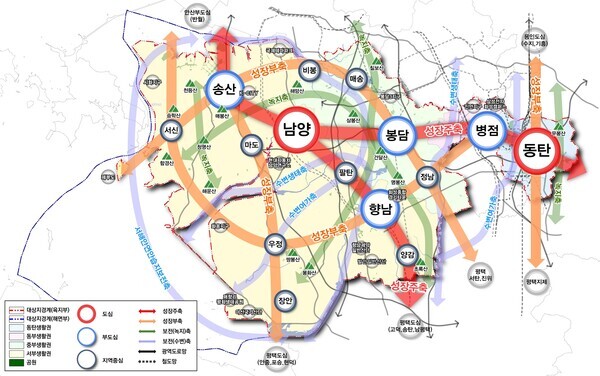 ‘2도심’은 남양과 동탄으로, 주요 도시 기능을 담당하는 시청이 위치한 행정 거점 ‘남양’과 경제ㆍ산업ㆍ교통 등 시의 전반적인 경제성장을 견인하는 ‘동탄’으로 설정됐다. 이를 통해 인접 시군간 광역적 연계와 동서간 균형발전을 도모한다는 계획이다.