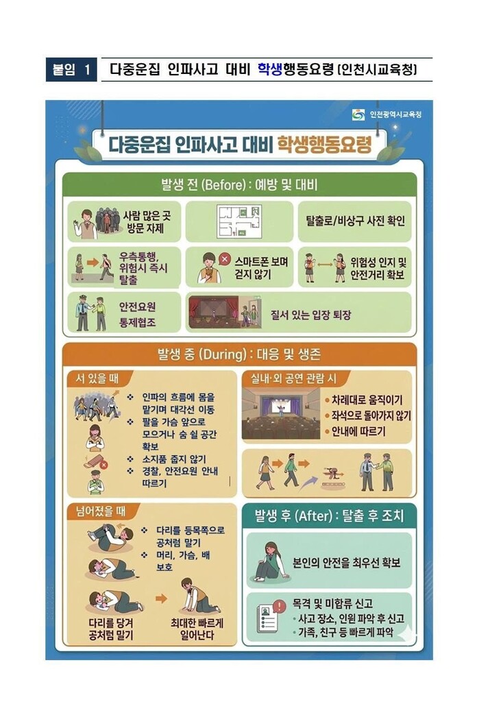 그러면서 무엇보다 학생은 물론, 공연을 찾는 교직원과 시민 모두의 안전이 최우선이라며, 가정과 학교에서도 다음 사항을 함께 살펴봐 주시길 부탁드린다고 말했다.