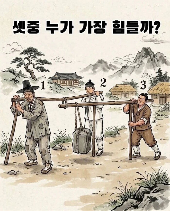 대부분은 앞에 있는 사람이 가장 힘들어 보인다고 생각한다. 실제로 어린아이들 눈에도 할아버지가 가장 힘들어 보인다고 한다. 하지만 실제로는 가운데 사람이 가장 큰 부담을 짊어지고 있다. 돌은 가운데에 매달려 있고, 양쪽이 막대를 받치고 있으며, 가운데 사람은 그 무게를 직접 어깨로 감당하고 있다고 말했다.