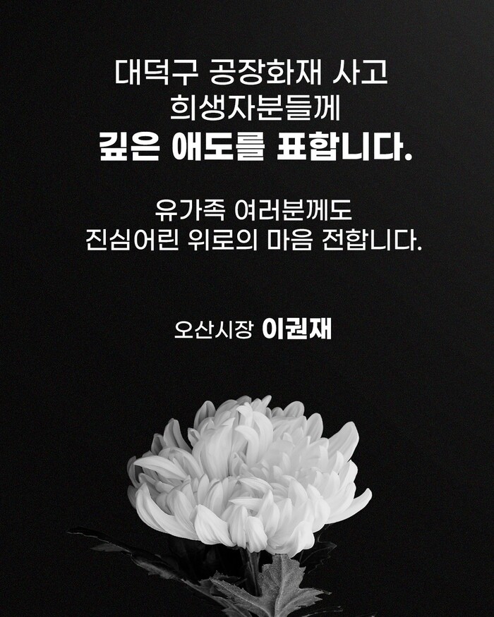 이권재 오산시장, “대전광역시 대덕구 공장 화재 사고로 희생되신 분들께 깊은 애도를 표합니다”