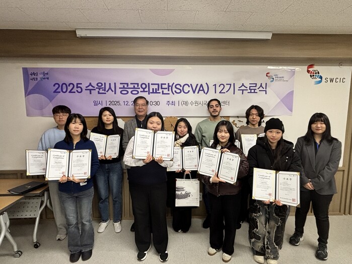 수원시국제교류센터가 22일 센터에서 ‘수원시 공공외교단(SCVA) 12기’ 수료식을 열고, 단원 16명에게 수료증을 전달했다. 우수활동자 4명에게는 상장을 수여했다.