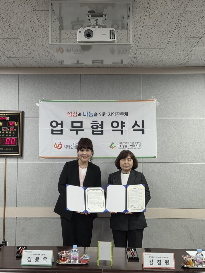 수원시 장안구 치매안심센터와 SK청솔노인복지관이 치매관리사업과 노인복지 활성화를 위한 업무협약을 체결하고, 협력을 약속했다.