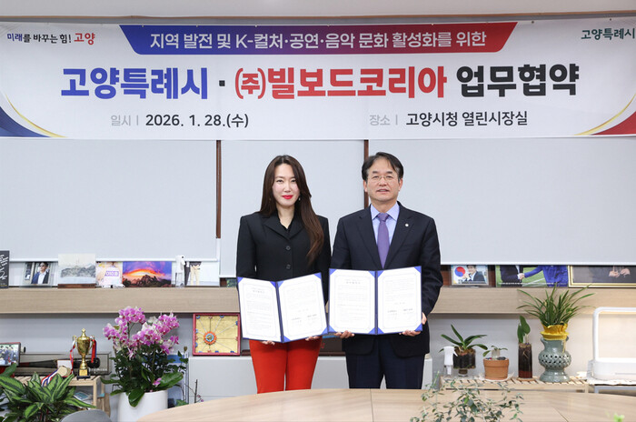 고양특례시(시장 이동환)는 지난 28일 열린시장실에서 글로벌 음악 미디어 브랜드 ‘빌보드 코리아’와 고양시의 글로벌 음악도시 이미지 제고 및 문화 교류 확대를 위한 업무협약(MOU)을 체결했다고 밝혔다.