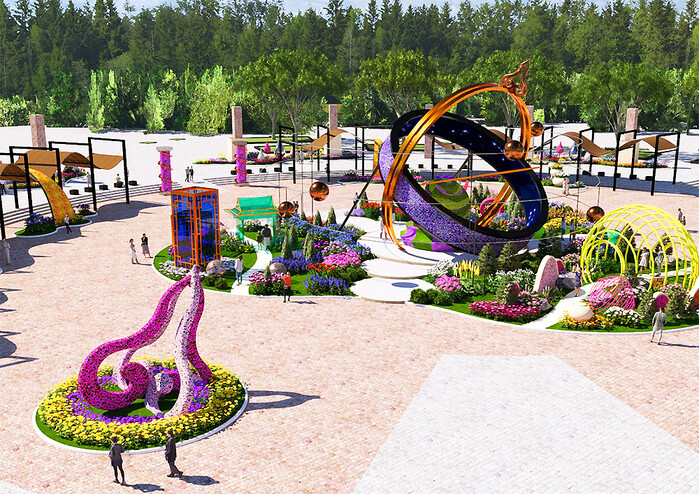 특히 높이 13m, 폭 26m 규모의 대형 랜드마크 구조물은 회전하는 구형 꽃조형물(키네틱 요소)을 통해 시간의 흐름을 상징적으로 표현하며 관람객들에게 압도적인 시각적 경험을 제공한다.