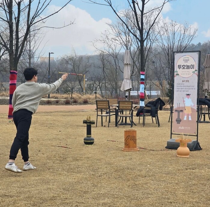 사진/한 시민이 수목원에 마련된 투호놀이 체험존에서 전통놀이를 즐기고 있다.(사진제공=수원시)