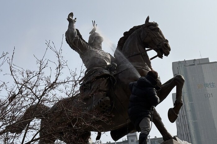 사진/장안구가 광교공원에 있는 강감찬 장군 동상을 세척하고 있다.(사진제공=수원시)
