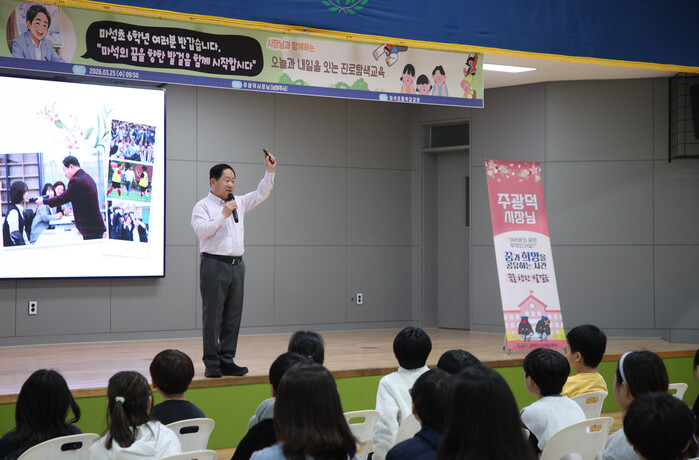 남양주시(시장 주광덕)는 25일 마석초등학교 6학년 학생을 대상으로 진로특강을 열고 학생들에게 꿈과 희망의 메시지를 전달했다고 밝혔다.