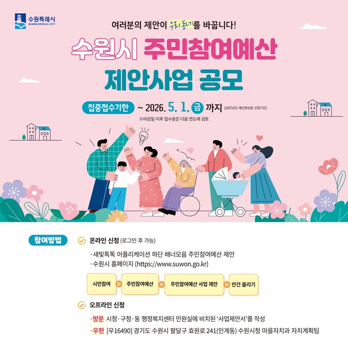 수원특례시(시장 이재준)는 2027년도 예산 편성을 위한 ‘주민참여예산 제안사업’을 5월 1일까지 공모한다.