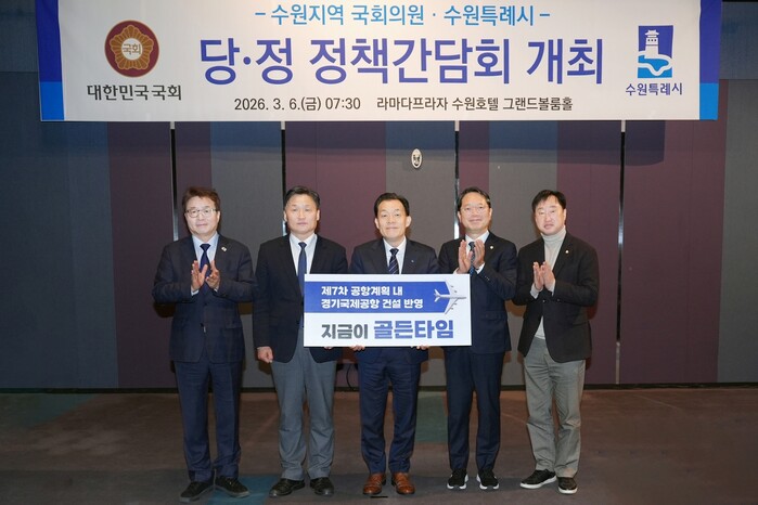이재준 수원특례시장은 6일 라마다프라자 수원호텔에서 열린 지역 국회의원들과 당·정 정책간담회에서 “제7차 공항개발 종합계획에 ‘경기국제공항’ 건설 내용이 반영될 수 있도록, 경기도와 협의해 달라”고 요청했다.