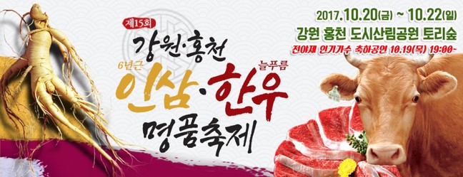 강원도 홍천군의 6년근 인삼과 한우를 한 자리에서 즐길 수 있는 '제15회 홍천인삼·한우명품축제'가 오는 10월 20일부터 22일까지 3일간 홍천도시산림공원 토리숲에서 개최된다.