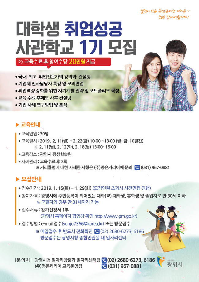광명시는 대학생과 대학졸업생을 대상으로 적성에 맞는 직업탐색 및 취업 기회를 제공하기 위해 ‘대학생 취업성공 사관학교’ 1기생 참여자를 모집한다.
