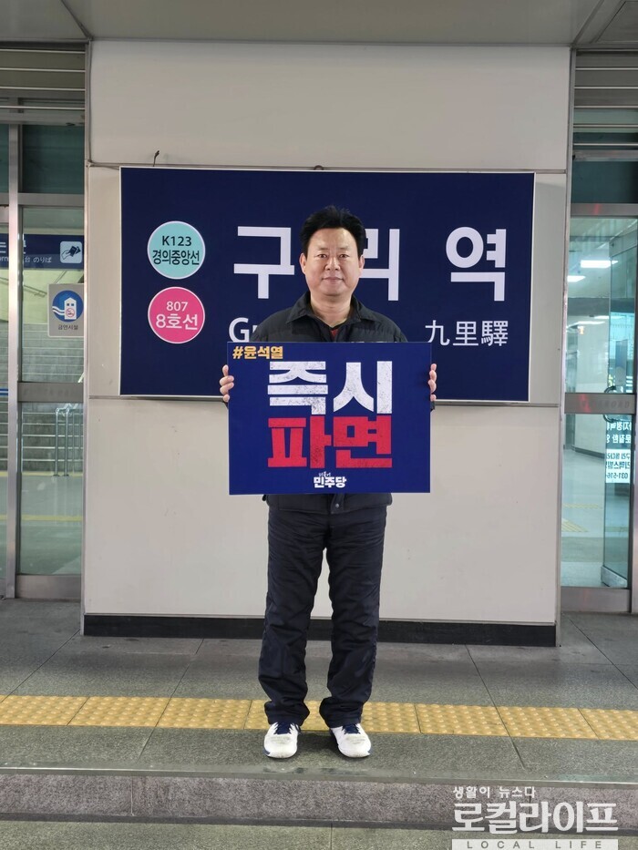 | ▲ 신동화 구리시의회 의장이 지난 3월 14일, 구리역에서 ‘윤석열 파면 촉구 1인 시위’를 하고 있다. (사진출처=신동화 페이스북) |