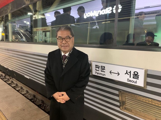 이재정 경기도교육감이 26일 ‘동・서해선 철도, 도로 연결 및 현대화 착공식’에 참석하기 위해 서울역에서 판문역으로 향하는 특별열차에 오르고 있다.