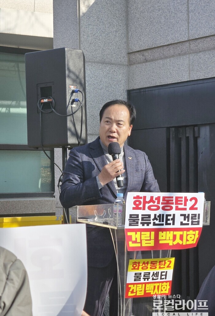 [오산=로컬라이프] 송준형 기자 = 오산시는 17일, 화성특례시청 앞에서 '동탄2 초대형 물류센터 건립 반대 집회'를 가졌다.