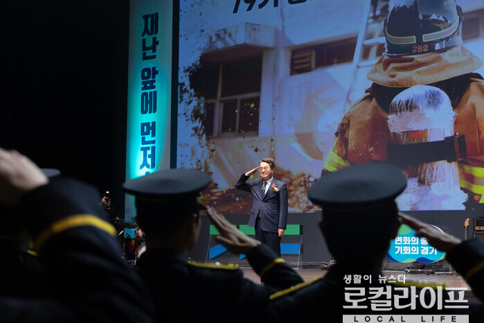 ▲ 김동연 경기도지사가 지난해 12월 19일 오전 경기아트센터에서 열린 '2025년 신임 소방공무원 임용식'에 참석해 신규 소방공무원들에게 거수경례로 답례하는 모습. (사진제공=경기도)