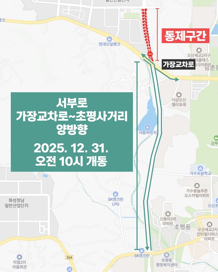 [오산=로컬라이프] 송준형 기자 = 서부로 가장교차로~초평사거리 구간의 양방향 차량 통행이 12월 31일 오전 10시부터 재개된다.