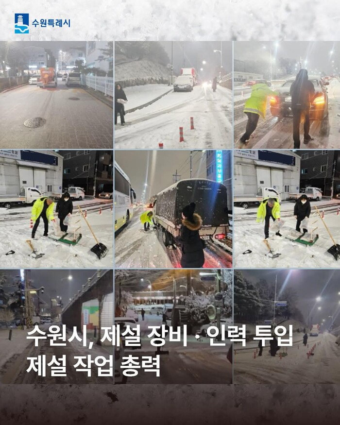 한편, 폭설 피해 관련 신고는 ▶장안구청 031-5191-5580 ▶권선구청 031-5191-6486 ▶팔달구청 031-5191-7062 ▶영통구청 031-5191-8964이다.