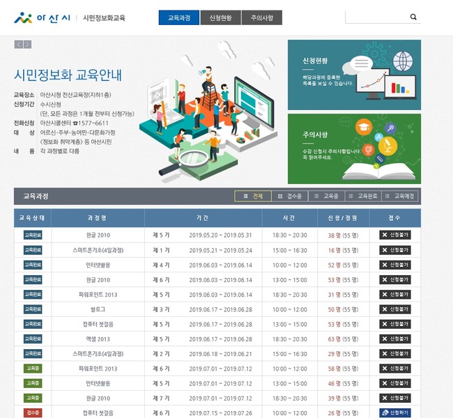 기타 자세한 시민정보화교육의 전 교육과정의 내용 및 일정은 아산시민정보화교육 홈페이지 에서 확인할 수 있다.