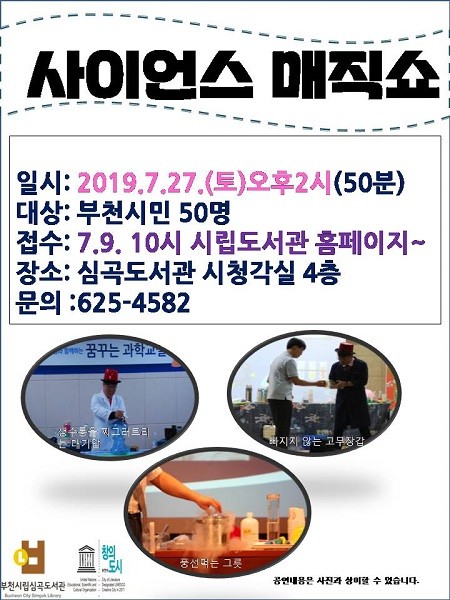 부천시립심곡도서관은 오는 27일 토요일 오후 2시에 온 가족이 함께 즐기는 ‘사이언스 매직쇼’를 공연한다.
