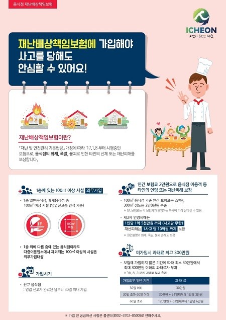 이천시 관계자는 “재난배상책임보험 재가입을 유도를 위해 신규 및 갱신대상 업소에 대해 재난배상책임보험 가입 안내문을 발송 등 가입유도를 적극홍보 하고 있으며, 재난배상책임보험에 해당하는 업종 영업주는 보험기간 만료 전까지 재가입할 것“을 당부했다.