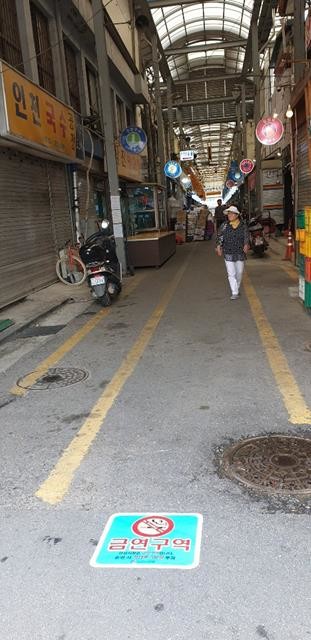 안성시보건소가 안성맞춤시장 길 바닥에 금연구역 표지판 을 설치했다.