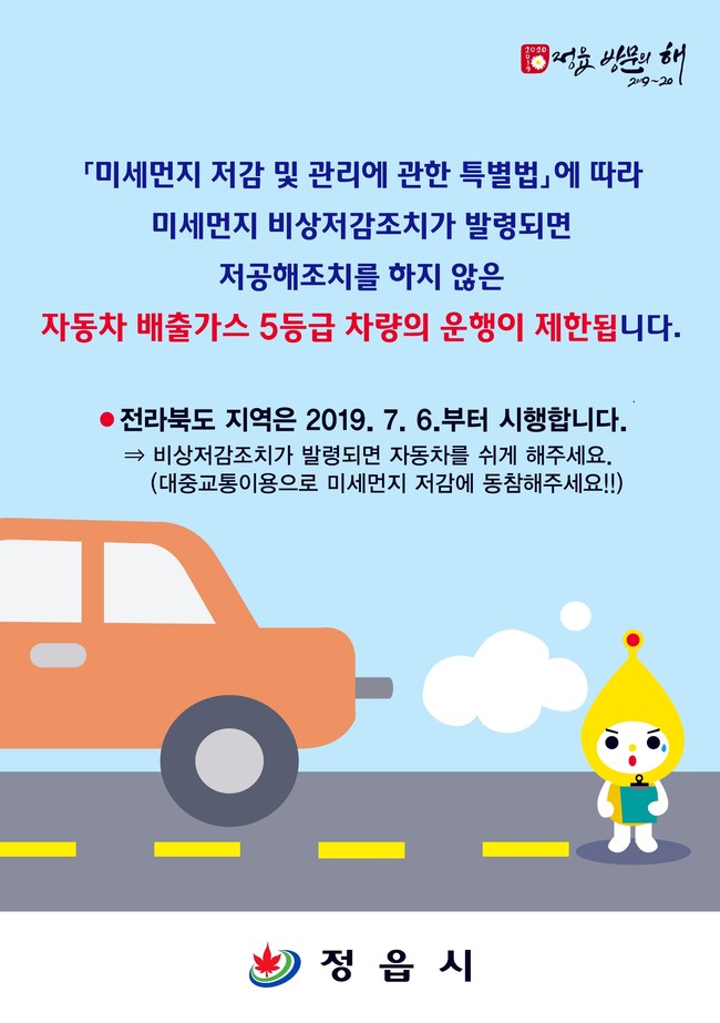 ‘미세먼지 저감 및 관리에 관한 특별법’이 지난 2월 15일 시행되고 ‘전라북도 고농도 미세먼지 비상저감조치 발령에 따른 자동차 운행제한에 관한 조례’가 오는 7월 6일부터 시행된 데 따른 것이다.