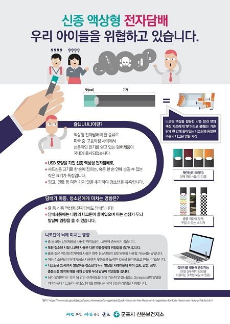 군포시가 신종 액상형 전자담배로부터 지역 청소년들을 지키기 위해 적극적인 지도단속 및 관련 제품의 위해성 홍보에 나섰다.