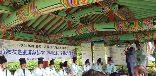 송도근 사천시장은 “구암한시협회가 짧은 역사 속에서도 다양한 지역행사에 참여해 한시의 전통문화 발전시키는 그 노고에 감사드리며, 이러한 옛 선조들의 시향이 깃든 뜻깊은 수양루 시회를 통해 사천시의 전통문화가 더욱 발전되고 한시 문화 확산되길 바란다”며 축하와 함께 격려의 인사말을 남겼다.