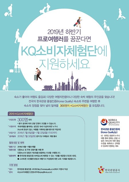 한국관광공사는 8일부터 오는 22일까지 한국관광 품질인증 숙박업소를 체험할 'KQ소비자체험단’ 300명을 모집한다.