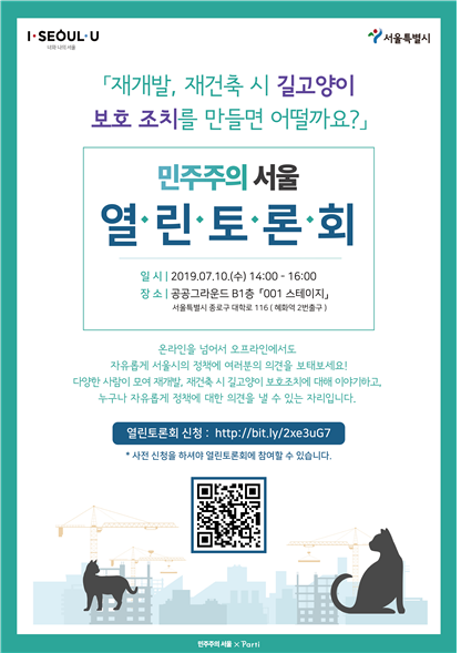서울시는 “재개발, 재건축시 길고양이 보호 조치를 만들면 어떨까요?” 라는 주제로 7월 10일 오후 2시에 토론회를 개최한다고 밝혔다. 동 주제는 ‘민주주의 서울’에 시민의 제안에서 출발했다.
