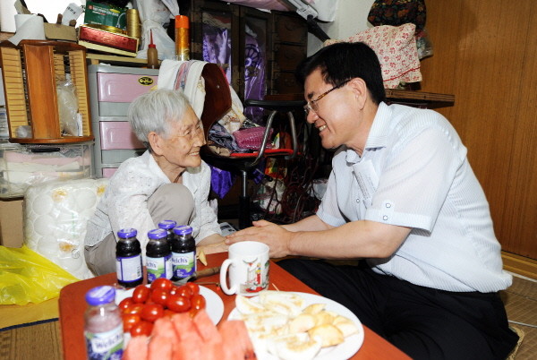 유덕열 동대문구청장이 보듬누리 사업으로 일대일 결연을 맺은 대상자의 집을 방문해 생활을 살피고 있다.