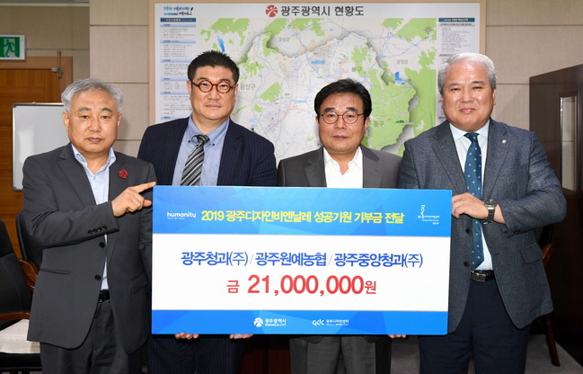 각화동농산물 도매시장 입주법인인 광주청과㈜, 광주중앙청과㈜, 광주원예농협이 오는 9월 열리는 광주디자인비엔날레 성공을 지원하기 위해 각 700만원씩 총 2100만원의 기부금을 광주시에 전달했다.