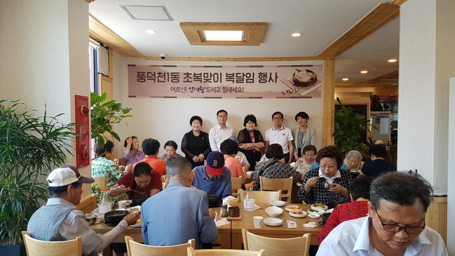 풍덕천1동은 관내 음식점 ‘엄재강 개성상황삼계탕’의 후원으로 이곳에서 저소득 어르신 30여명에게 원기를 회복할 수 있는 삼계탕을 대접했다.