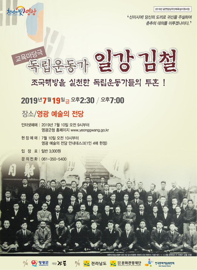 영광군은 오는 19일 오후 2시 30분, 7시에 영광예술의전당 대공연장에서 ‘독립운동가 일강 김철’을 공연한다.