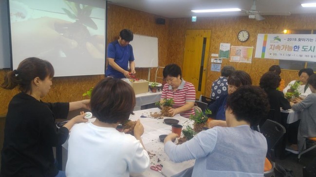 수강생들의 참여와 흥미를 유발하기 위해 이론교육 이외에 다양한 교재·교구를 활용한 실습교육을 진행해 실생활에서 사용가능한 친환경 LED스탠드, EM발효액, EM비누, EM천연화장품, 해양 부유 유리 활용 목걸이, 공기정화식물 토피어리, 폐 양말을 활용한 유아용 베개 등을 제작했다.