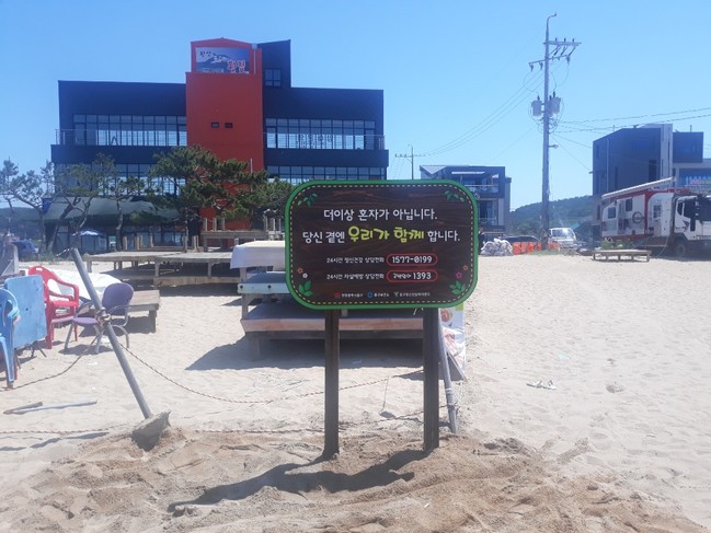 표지판에는 ‘더 이상 혼자가 아니다. 당신 곁엔 우리가 함께 한다.’라는 문구와 상담전화번호가 적혀 있다. 삶이 힘겹고 위로가 필요할 때 극단적 선택을 하지 않고 표지판에 적힌 상담전화번호에 연락을 하면 언제든지 도움을 청할 수 있다.