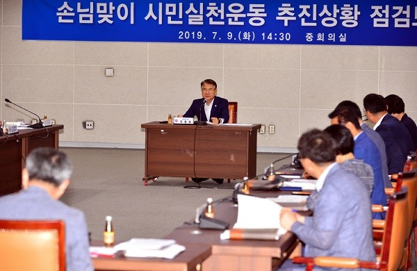 광주광역시는 9일 시청 중회의실에서 정종제 행정부시장 주재로 세계수영대회 ‘손님맞이 시민실천 운동 추진상황 점검 보고회’를 개최했다.