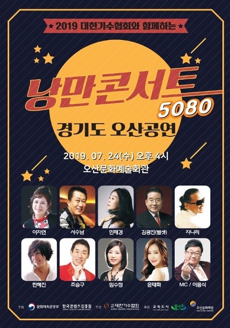 문화체육관광부 한국콘텐츠진흥원 주최, 대한가수협회 주관, 오산시,오산문화재단 후원 낭만콘서트는 ‘당신의 의미’‘찰랑 찰랑’의 이자연, ‘보고싶은 얼굴’, ‘내 마음 당신 곁으로’의 민해경, ‘들풀같은 여자’, ‘꽃바람 여인’의 조승구, ‘연인들의 이야기’‘사슴여인’의 임수정, ’갈색추억‘’사랑이 뭐길래‘의 한혜진 등 7080인기가수들과, ’뜨거운 안녕‘’사노라면‘의 쟈니리, ’과수원길‘’동물농장‘의 서수남, ’전우‘’망각‘의 별셋 김광진 등 5060스타들, ’건배송‘’아야아야‘의 윤태화가 5080 콜라보 무대를 펼친다. ’뽀식이‘이용식이 MC를 맡는다.