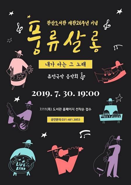 안산시가 관산도서관 개관 26주년을 맞아 오는 30일 오후 7시 관산도서관 지하강당에서 가족단위 시민들을 대상으로 ‘풍류살롱 : 내가 아는 그 노래’라는 주제의 퓨전국악 음악회를 진행한다고 10일 밝혔다.