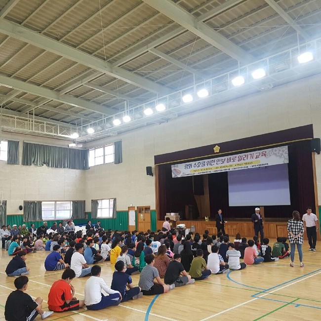 교육장인 이원중학교 강당에는 전교생 50명과 국가유공자 50명이 모여 나라사랑의 중요성, 통일한국의 비전과 준비 자세를 주제로 국가보훈처 경남동부보훈지청장을 역임한 류대식 강사의 강연을 함께했다.