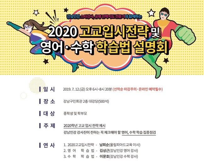 ‘기분 좋은 변화, 품격 있는 강남’으로 도약 중인 강남구가 12일 오후 6시 대치동 강남구민회관 대강당에서 중학생 및 학부모 500명을 대상으로 ‘2020 고교입시전략 및 영어·수학 학습법 설명회’를 개최한다.