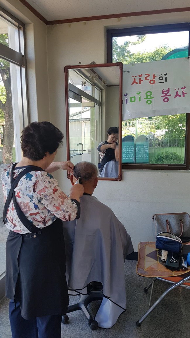 이날은 부쩍 더워진 날씨에 이·미용봉사를 위해 경로당에 직접 찾아온 신천자 미용사의 이마에 구슬땀이 송골송골 맺혔지만, “어르신들과 담소를 나누며 시원하게 정리된 어르신들의 머리를 보면 보람을 느낀다.”며, 미소를 지었다.