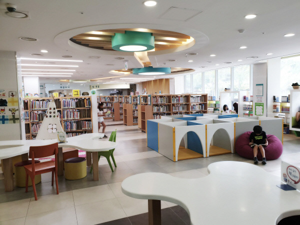 서가에 꽉찬 장서, 넓은 자리를 차지했던 등받이 소파 대신 어린이들의 상상력과 흥미를 자극하는 어린이캐럴공간과 영어특화 서가로 재탄생하게 됐다. 서가측면을 활용한 전시공간은 어린이들의 호기심을 유발해 아름다운 그림책의 세계로 이끌고 있다.