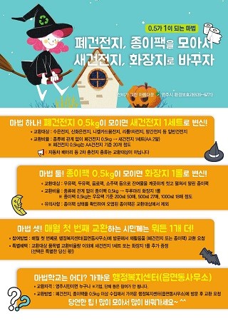 교환방법은 폐건전지와 종이팩 모두 0.5kg 이상씩 모은 다음 가까운 읍면동 행정복지센터를 방문해 새건전지와 화장지로 교환을 요청하면 되고, 무게 0.5kg당 폐건전지는 새건전지 1세트, 종이팩은 두루마리 화장지 1롤로 바꿀 수 있다.