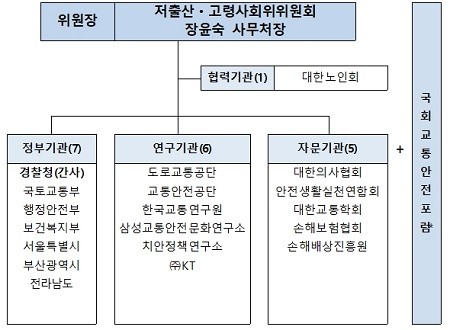 저출산·고령사회위원회와 경찰청은 최근 급증하고 있는 고령자 교통사고 문제를 해결하기 위해 저출산·고령사회위원회의 장윤숙 사무처장을 위원장으로 대한노인회, 대한의사협회 등 21개 기관이 참여하는 ‘고령운전자 안전대책 협의회’를 10일 발족했다.