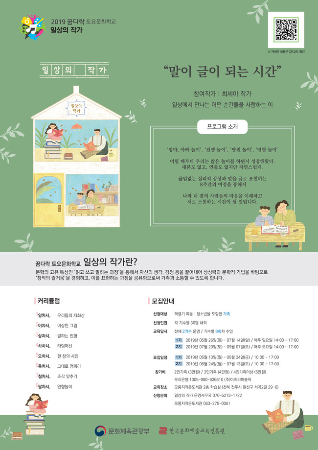 전주시 모롱지작은도서관은 오는 20일부터 9월 7일까지 매주 토요일 오후 2시부터 진행되는 ‘2019 꿈다락 토요문화학교: 일상의 작가’ 2기 참가자를 모집한다.