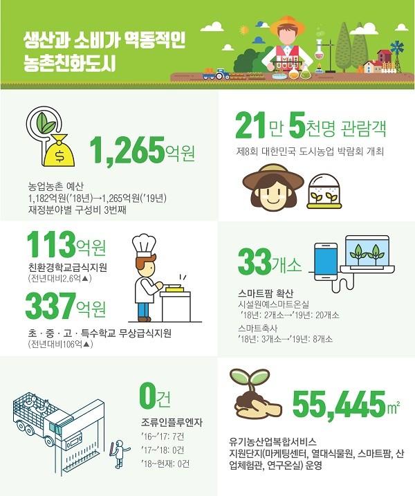우선 농업·농촌분야에 지원하기 위한 농업예산을 전년대비 6.96%를 증가 1,264억 6600만 원을 투입해 농업생산기반시설 확충, 농촌지역 정주여건 개선, 친환경농업육성, 농산물 생산·유통 경쟁력 강화, 농산물 브랜드육성, 해외시장개척, 친환경급식, 가축질병예방, 미래농업 스마트팜 확산, 도시농업 활성화 등 전방위적으로 추진하고 있다.
